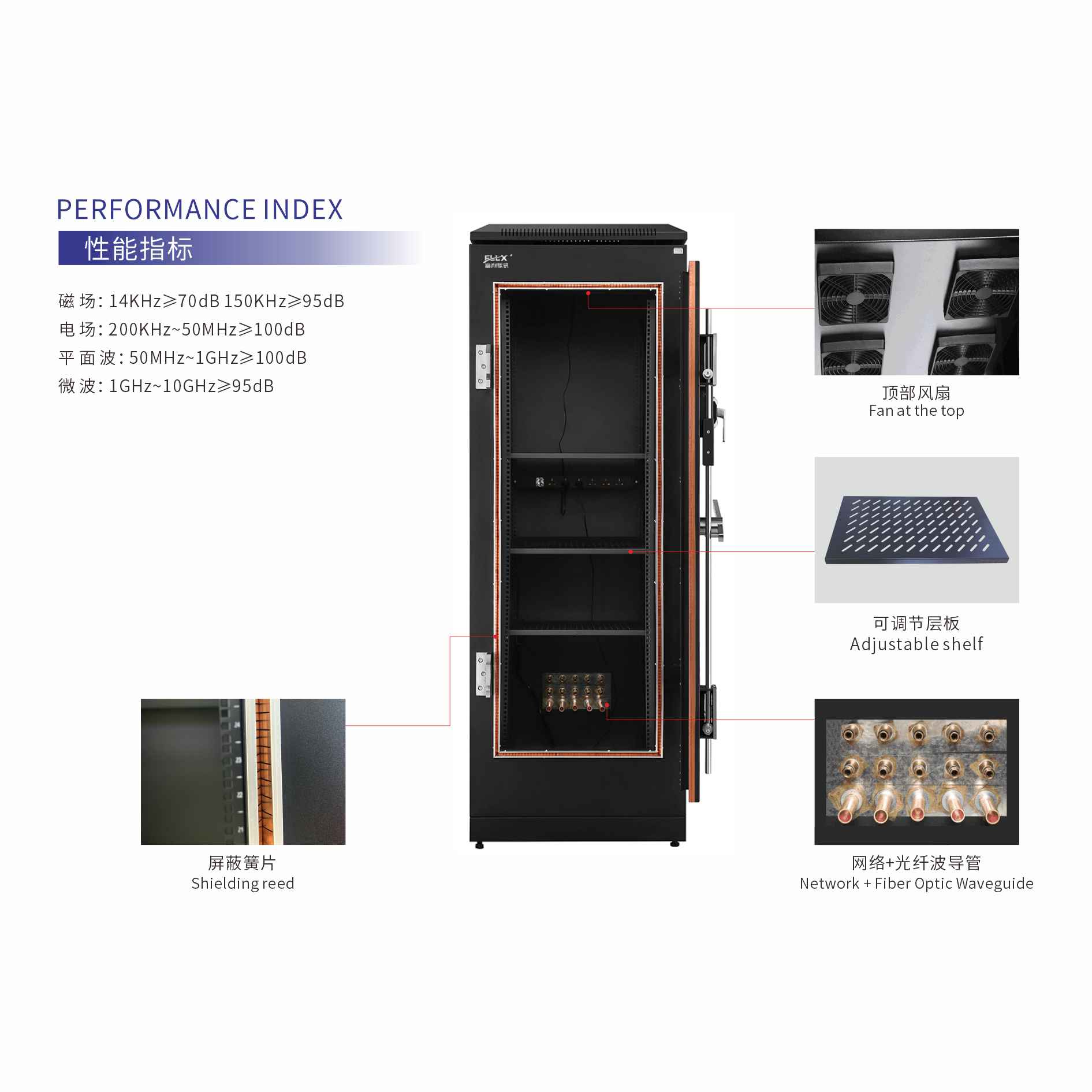 · 可选装智能温控模块、屏蔽效能监测模块、LED显示模块, 电磁门禁模块。